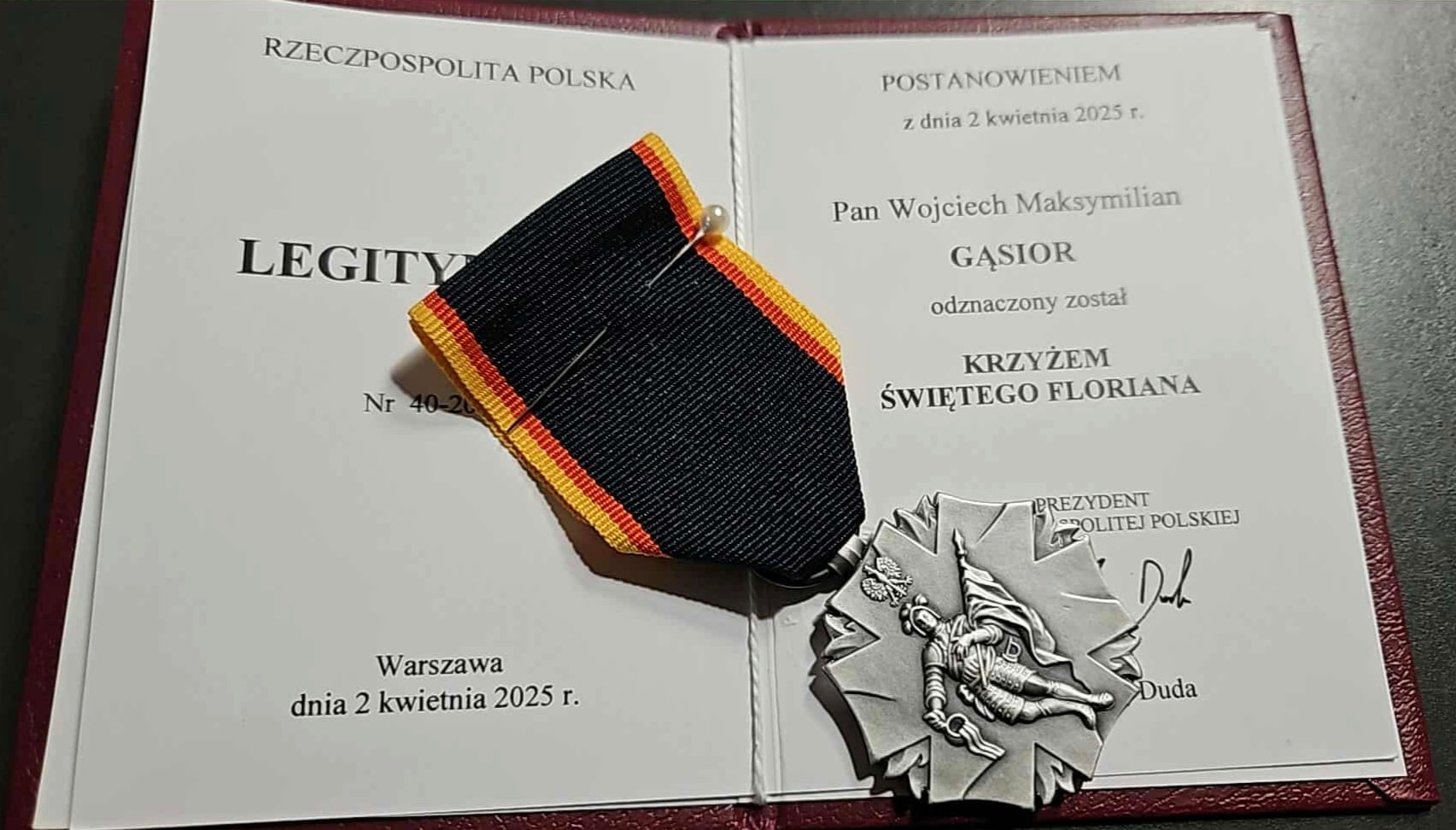 Z ogromną dumą i radością informujemy, że nasz Druh Naczelnik Wojciech Gąsior, który od lat z oddaniem i sercem służy naszej jednostce, został uhonorowany Krzyżem Świętego Floriana – wyjątkowym odznaczeniem przyznawanym za szczególne zasługi na rzecz ochrony przeciwpożarowej.